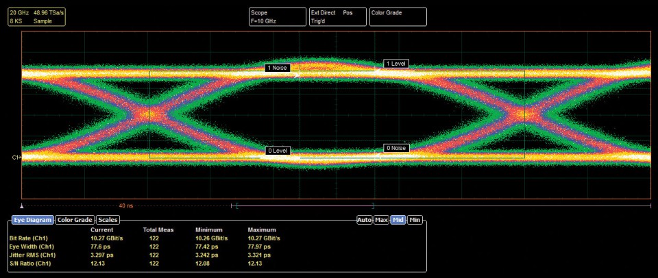 可選擇灰度和顏色分級顯示模式,以幫助分析眼圖中的噪聲和抖動。還有一個統計顯示,顯示原始掩碼和邊距的失敗計數。