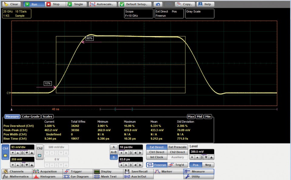 PicoScope 9300系列采樣示波器使用觸發順序采樣來捕獲高帶寬重復或時鐘衍生信號,而無需高速時鐘采樣系統(如實時示波器)的費用或抖動。25 GHz帶寬允許測量14 ps轉換,低采樣抖動使定時分辨率低至0.064 ps。1 MS / s的順序采樣率,可以快速構建波形,眼圖和直方圖。