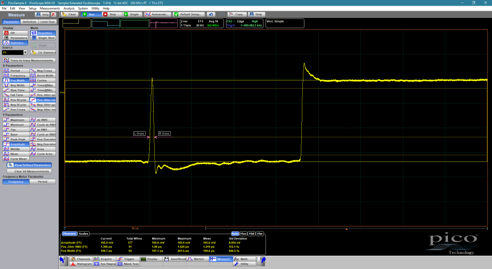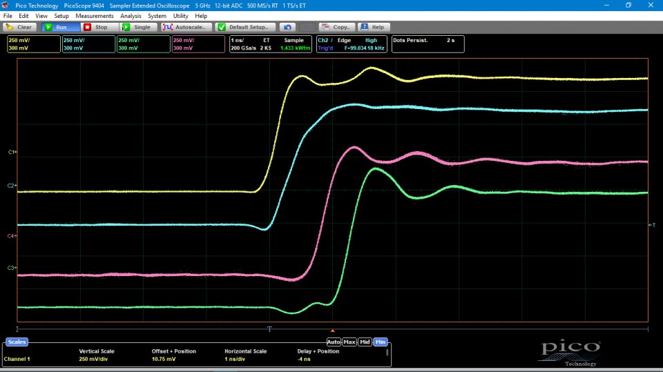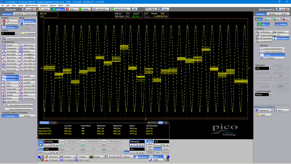 獨特的是,PicoScope 9404 SXRTO在ETS中的最大有效采樣率為1 TS / s。這相當于僅1 ps的定時分辨率,比其實際最大采樣率高20,000倍。