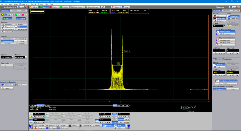 PicoScope 9404-05 SXRTO的模擬帶寬為5 GHz。這意味著它需要至少10 GS / s的采樣率,但是為了在沒有插值的情況下精確重建波形,我們需要遠高于此值。9404在5 GHz的單個周期和最小寬度脈沖的140個點為我們提供200個采樣點。