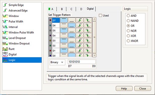 在PicoScope 5000D MSO模型上,數字通道可用于與布爾運算符形成邏輯觸發器。
