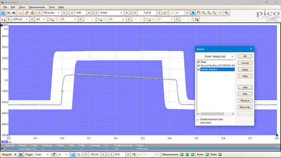 您可以對PicoScope進行編程,以便在檢測到掩碼限制失敗,觸發器和緩沖區已滿等事件時執行操作。。