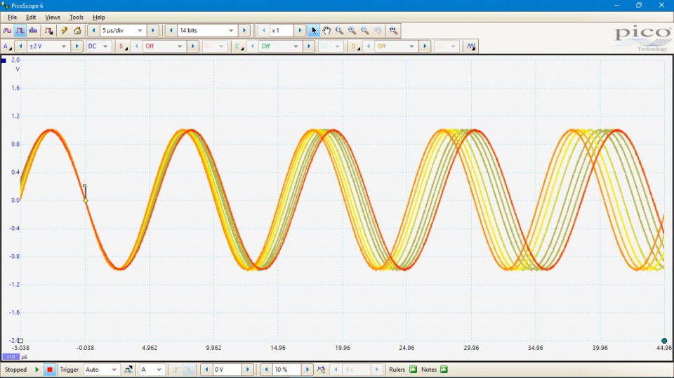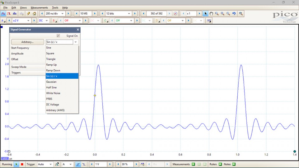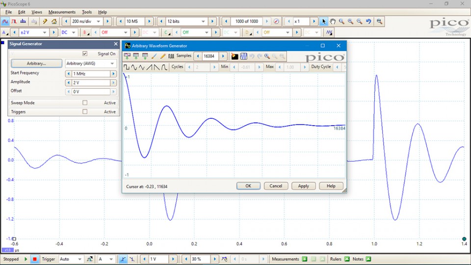 所有PicoScope 5000D單元都內置14位200 MS / s任意波形發生器(AWG)。您可以使用內置編輯器創建和調整任意波形,從現有示波器軌跡導入它們,或從電子表格加載波形。