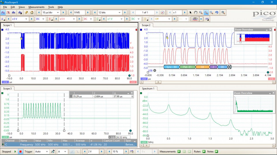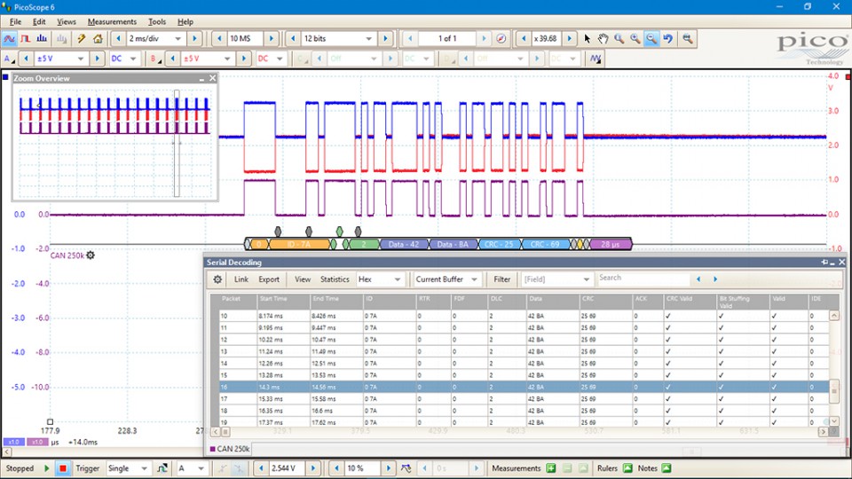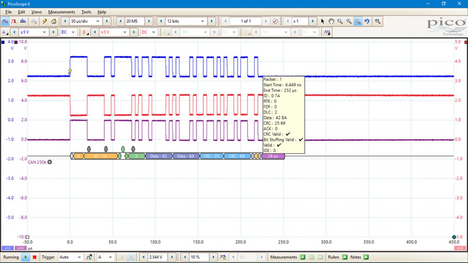 表格格式顯示了已解碼幀的列表,包括數據和所有標志和標識符。您可以設置過濾條件以僅顯示您感興趣的幀或搜索具有指定屬性的幀。統計選項顯示有關物理層的更多詳細信息,例如幀時間和電壓電平。PicoScope還可以導入電子表格,將數據解碼為用戶定義的文本字符串。