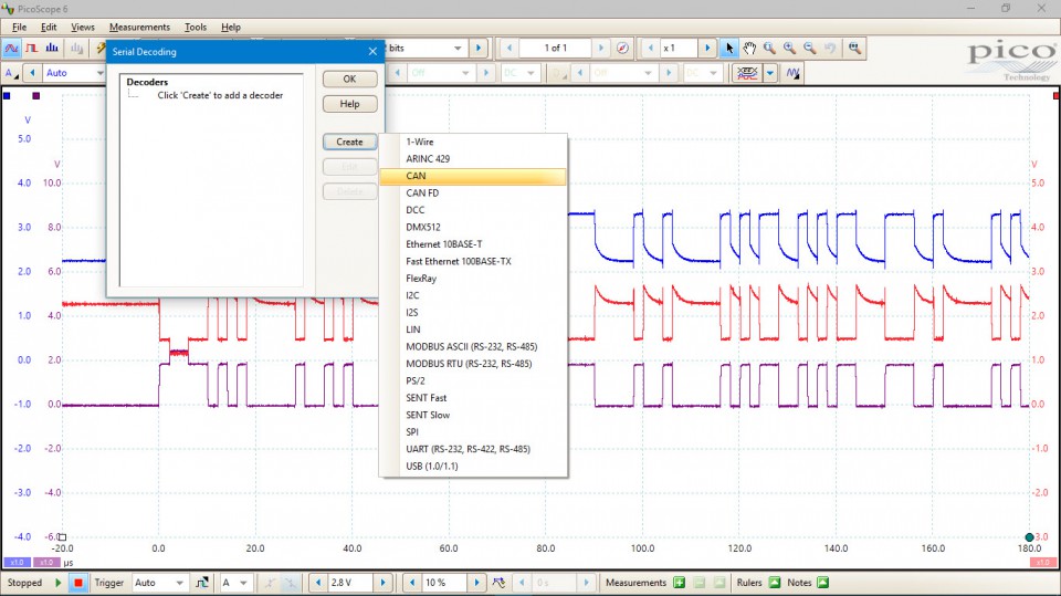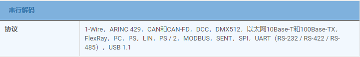 憑借其深存儲器,PicoScope 5000D系列可解碼1-Wire,ARINC 429,CAN和CAN-FD,DCC,DMX512,以太網10Base-T和100Base-TX,FlexRay,I2C,I2S,LIN,PS / 2,MODBUS ,SENT,SPI,UART(RS-232 / RS-422 / RS-485)和USB 1.1協議數據作為標準配置。