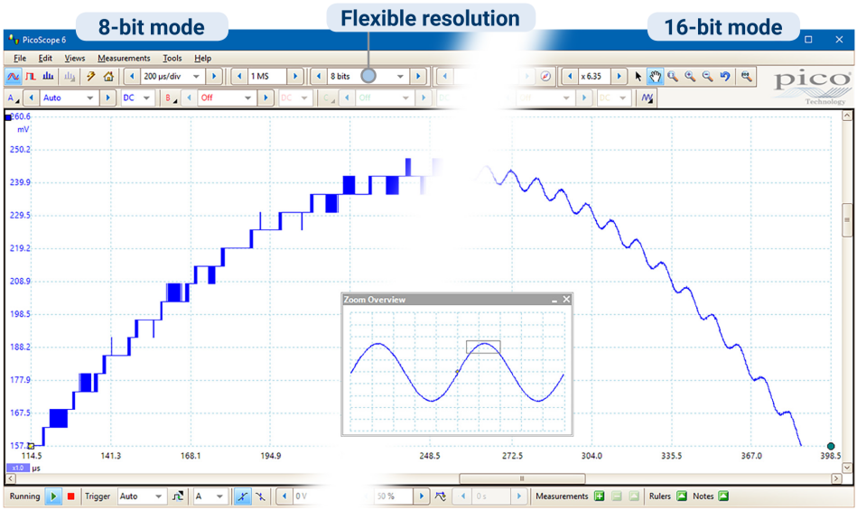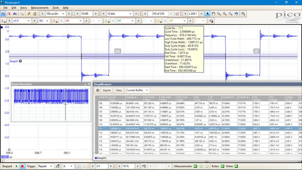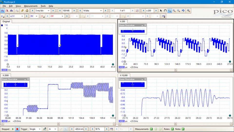 深存儲器在其他方面也很有用:PicoScope允許您將捕獲存儲器劃分為多個段,最多可達10 000個。您可以設置觸發條件以在每個段中存儲單獨的捕獲,只需少量捕獲之間的1μs死區時間。獲取數據后,您可以逐個瀏覽內存,直到找到要查找的事件。包含強大的工具,允許您管理和檢查所有這些數據。除了屏蔽限制測試和色彩持久模式等功能外,PicoScope 6軟件還可以讓您將波形放大幾百萬倍。“縮放概覽”窗口允許您輕松控制縮放區域的大小和位置。