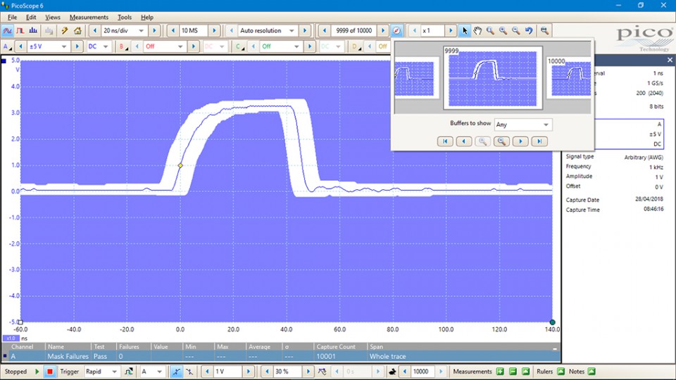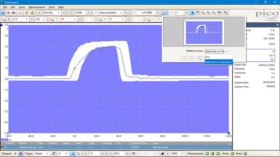 只需捕獲已知的良好信號,在其周圍繪制一個遮罩,然后連接待測系統。PicoScope將檢查掩碼違規并執行通過/失敗測試,??捕獲間歇性毛刺,并可在“測量”窗口中顯示故障計數和其他統計信息。