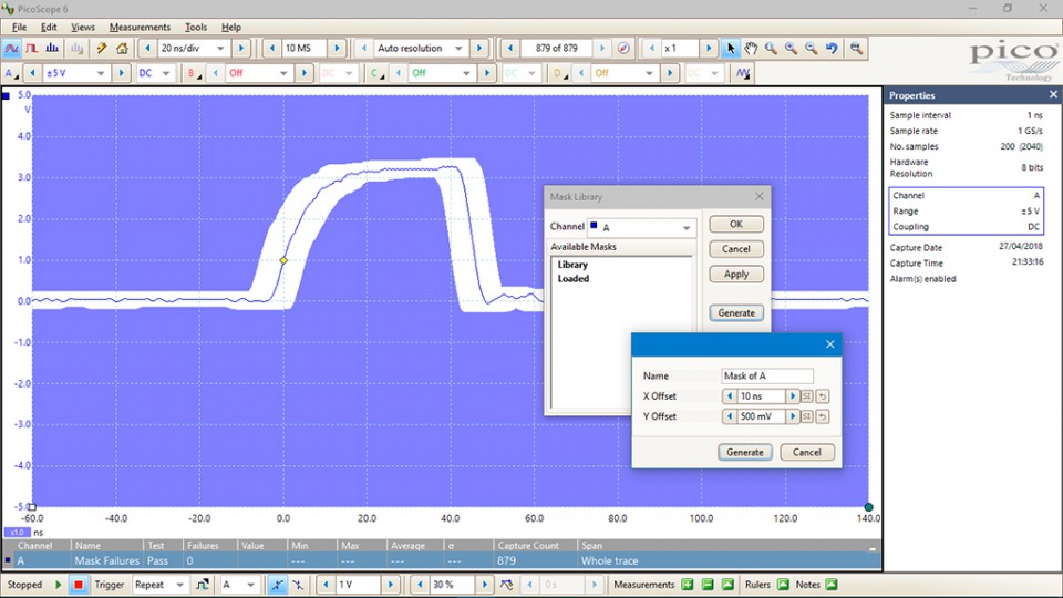 掩模限制測試允許您將實時信號與已知良好信號進行比較,并且專為生產和調試環境而設計。只需捕獲已知的良好信號,在其周圍繪制一個遮罩,然后連接待測系統。PicoScope將檢查掩碼違規并執行通過/失敗測試,??捕獲間歇性毛刺,并可在“測量”窗口中顯示故障計數和其他統計信息。