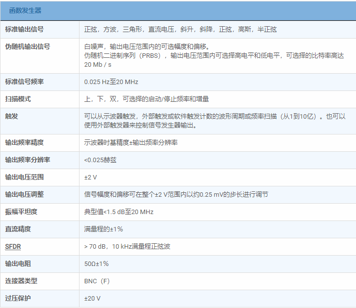 AWG還可以作為函數發生器,具有一系列標準輸出信號,包括正弦,方波,三角波,直流電平,白噪聲和PRBS。除了設置電平,偏移和頻率的基本控制,更高級的控制允許您掃描一系列頻率。