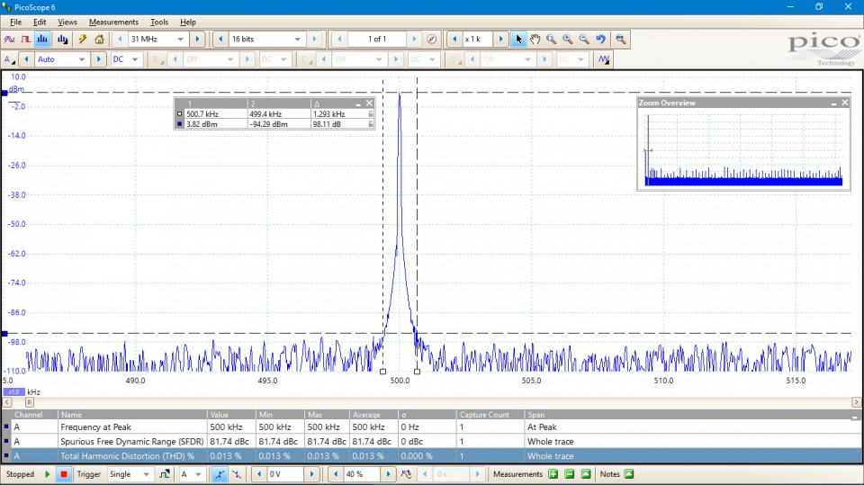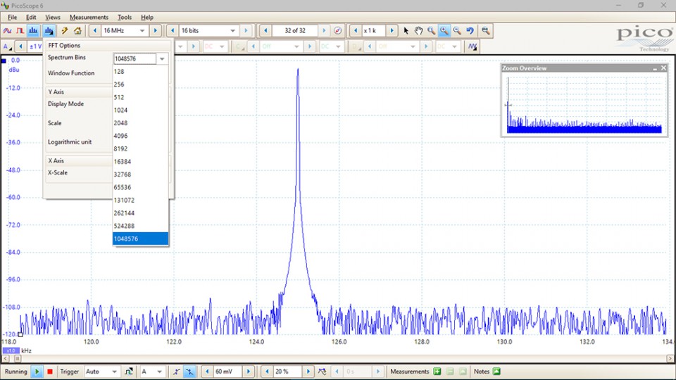 頻譜視圖根據頻率繪制幅度,非常適合查找信號中的噪聲,串擾或失真。PicoScope中的頻譜分析儀采用快速傅立葉變換(FFT)類型,與傳統的掃描頻譜分析儀不同,它可以顯示單個非重復波形的頻譜。