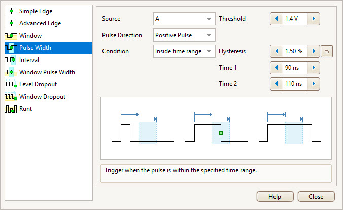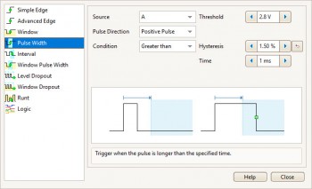 PicoScope 5000D系列提供高級觸發器,包括脈沖寬度,欠幅脈沖,窗口和壓差。