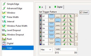 MSO型號上可用的數字觸發器允許您在16個數字輸入中的任何一個或全部與用戶定義的模式匹配時觸發示波器。您可以單獨為每個通道指定條件,也可以使用十六進制或二進制值一次為所有通道設置模式。您還可以使用邏輯觸發器將數字觸發器與任何模擬輸入上的邊沿或窗口觸發器組合在一起,例如觸發時鐘并行總線中的數據值。
