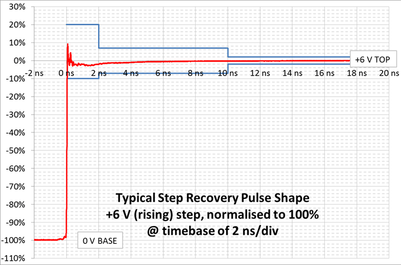 脈沖轉換時間通常為55 ps,頻譜內容(與模擬的理想無限快速邊沿相比)延伸至約-10 GHz @ -10 dB。