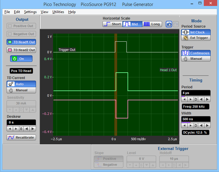 正(快速上升)和負(快速下降)脈沖均以地為參考,每個脈沖的極性與其用戶選擇的幅度相反。該幅度(“標記”)保持用戶選擇的脈沖寬度,然后返回到地。在用戶設置的釋抑時段內防止了進一步的脈沖,此后將在下一次接收的觸發后40ns重復。選擇內部時鐘時,脈沖將在用戶設定的周期內重復,并且釋抑無效。在每個脈沖之前40 ns產生輸出觸發,但是啟動。