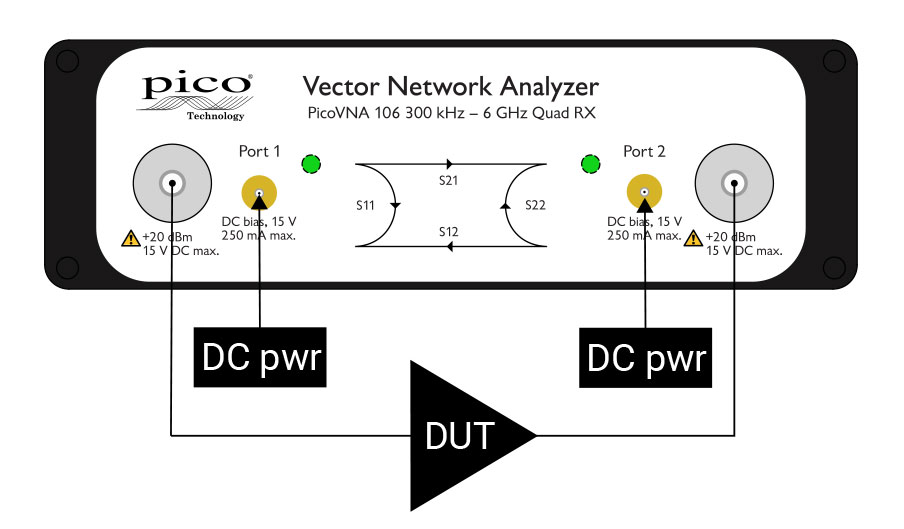 Bias-Ts通常不在其他VNA上提供,或作為昂貴的附加物提供。使用PicoVNA 106的內置偏置Ts為有源器件提供直流偏置或測試激勵,而無需外部DC模塊的復雜性和成本。偏置由外部電源或測試源提供,路由到與每個VNA端口相鄰的SMB連接器。