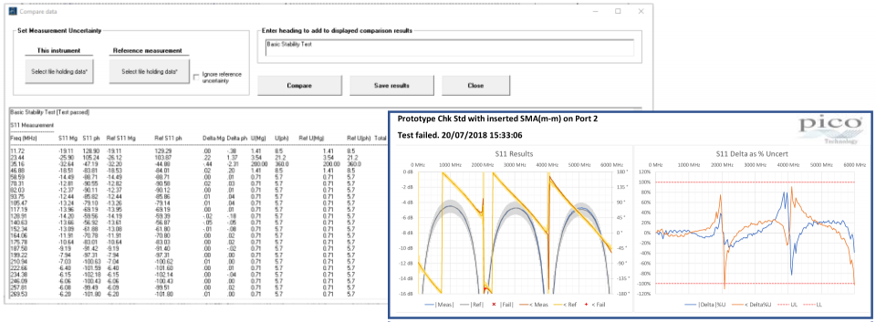 提供的序列號檢查標準的Touchstone測量數據作為“參考”測量加載到PicoVNA存儲器軌跡中。通過建立有效的完整S參數,全量程校準并在測試端口之間連接檢查標準,比較實用程序執行測量。然后,它在每個頻率點將測量值與存儲的“參考”數據進行比較和制表。將幅度和相位差列表。該實用程序結合了儀器和測試引線的不確定性(各自的規格)以及檢查標準(也提供)的測量不確定性和穩定性。然后將參考和測量之間的差異與總不確定性進行比較,得出“通過”(在不確定性內)或“失敗”(在不確定性外)的結果。