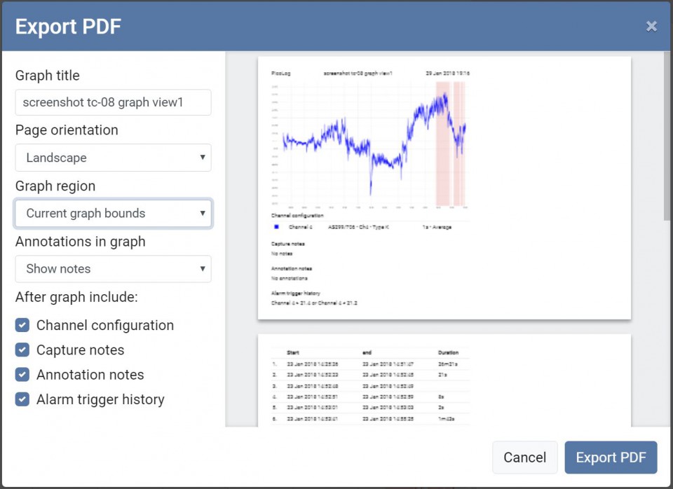 想要導(dǎo)出屏幕截圖?PicoLog 6包含一個(gè)將圖形導(dǎo)出為PDF的功能:再次選擇整個(gè)捕獲或感興趣的縮放區(qū)域。導(dǎo)出為PDF格式還包括用于包含警報(bào)觸發(fā)歷史記錄,注釋,通道配置和捕獲注釋的選項(xiàng),以獲取完整的捕獲報(bào)告。