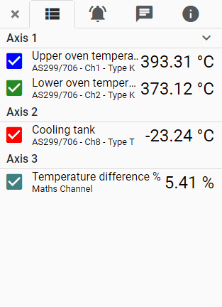 添加額外的圖形軸對(duì)于多通道測(cè)井應(yīng)用也是需要的,其中測(cè)量單位對(duì)于每個(gè)通道是不同的,或者當(dāng)通道測(cè)量該范圍的相對(duì)端的值時(shí)。例如,同時(shí)測(cè)量超過1000°C的內(nèi)部爐溫和環(huán)境溫度需要兩個(gè)軸,以便可以看到兩者的細(xì)節(jié)。您一次最多可以查看四個(gè)具有不同范圍的軸。