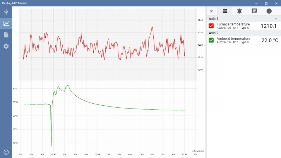 屏幕左側(cè)的簡(jiǎn)單垂直菜單欄可以永久訪問主程序菜單和PicoLog 6的查看模式,而不會(huì)暫停捕獲。