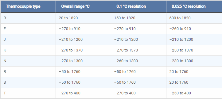 支持所有常用類型的熱電偶, 有效溫度范圍為-270至+ 1820°C(實(shí)際溫度范圍取決于所使用的熱電偶)。